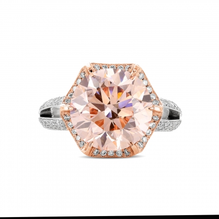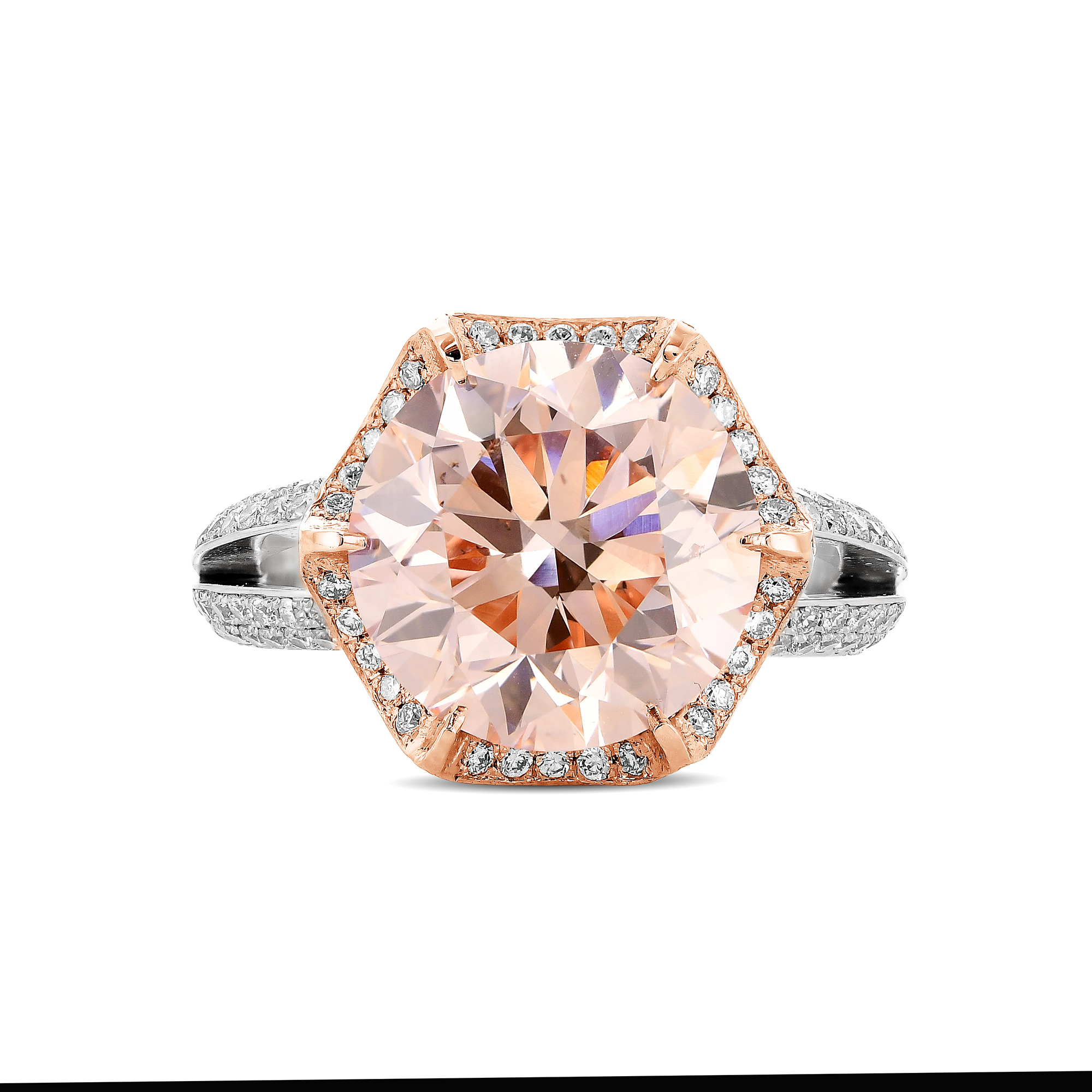 RT101 טבעת יוקרה מעוצבת בזהב ורוד ולבן משובצת ביהלום מרכזי ורוד ומסביב יהלומים לבנים